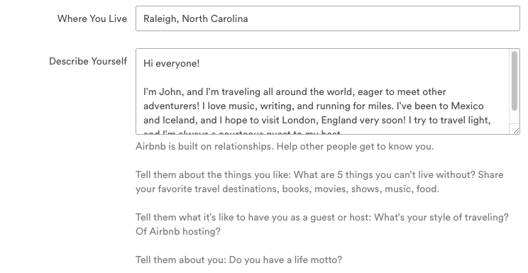 Because Airbnb is an active and welcoming community, we highly recommend adding your photo and other personal information to your profile. To fill out your profile, hover over the Profile icon in the upper-right corner and select Edit Profile.