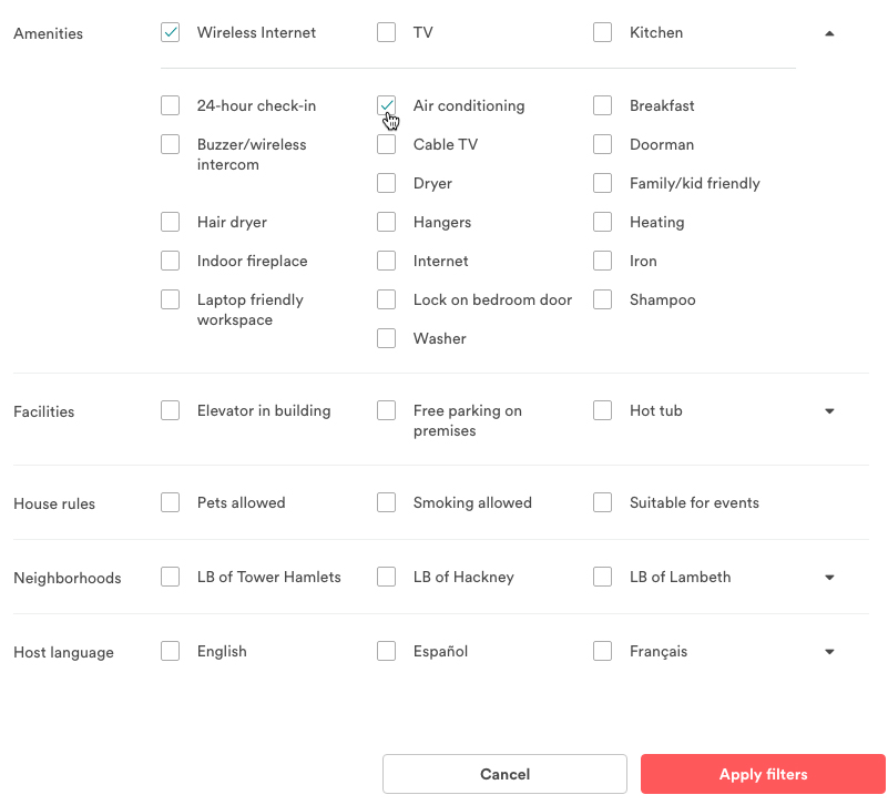 Other filtering options: Here, you can search for homes that only have specific amenities, such as wireless Internet or air conditioning. You can even search for hosts who speak a specific language or live in a certain neighborhood.