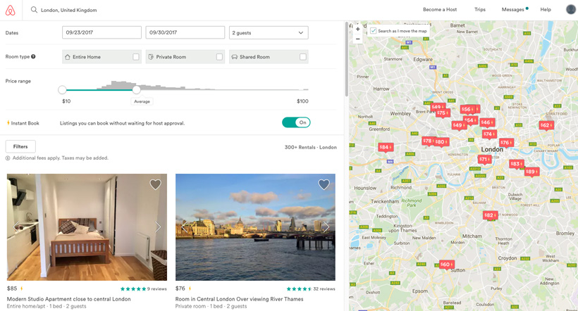 Let’s say you and a friend want to visit London Sept. 23-30 and you need a place to stay. On the main Airbnb page, enter your destination, dates, and the number of guests, then click Search.