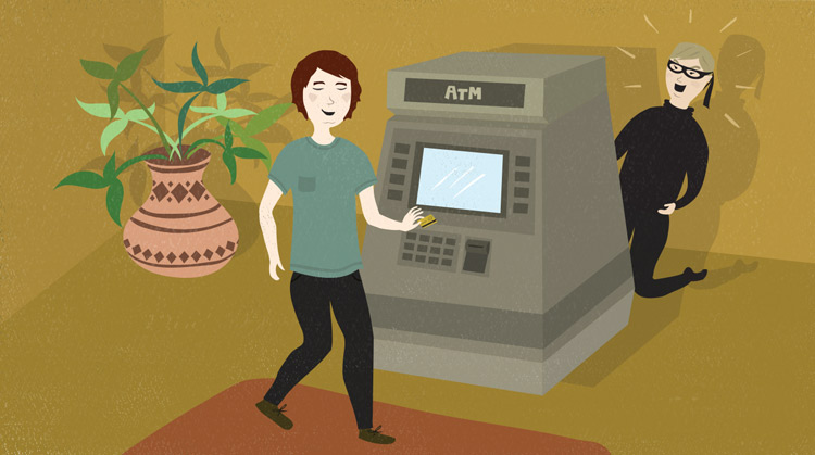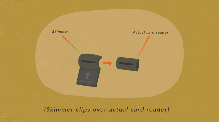 Skimmers are generally difficult to spot. More often than not, they're made to look like regular card readers and they snap on top of existing ones at ATMs, gas pumps, cashier stations, and more. The only way to really tell if a skimmer is being used is to gently pull on the card reader to make sure it's real. If it doesn't pop off, the odds are good that it's not a skimmer.