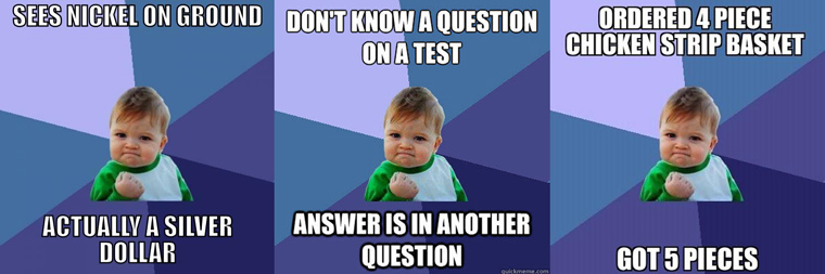 Most of them also allow for variations on a theme, with people taking the picture or video and altering it with different captions or edits. For example, one popular meme is Success Kid, a picture of a child pumping his fist. People caption this picture with various unexpected examples of success, as seen below.