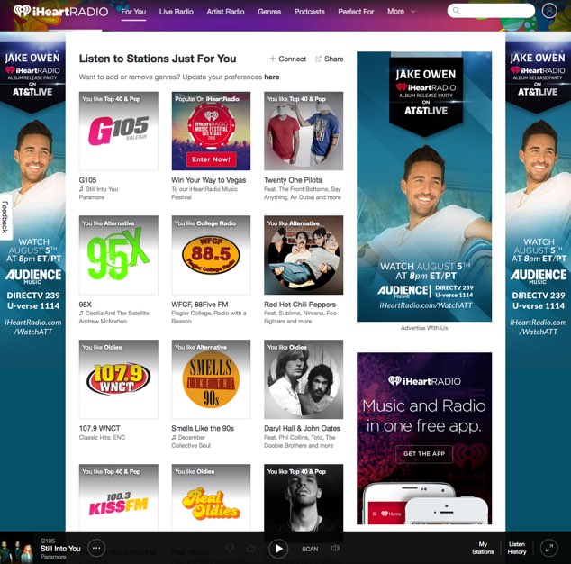 iHeartRadio offers free access to hundreds of live radio stations, as well as customized ad-free radio stations generated from an artist, song, or genre of your choosing. It's great for tuning in to your favorite radio shows and discovering new artists, but it's important to note that you can't pause or rewind while listening. Also, iHeartRadio is currently only available in North America, Australia, and New Zealand.