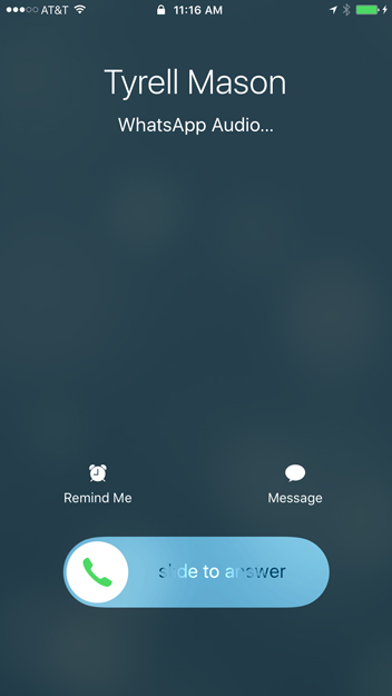 When someone calls you via WhatsApp, it will look similar to when you receive a regular phone call, but it will display the words WhatsApp Audio somewhere on the screen. In our example, our screenshot is from an iPhone, so it may look different to you depending on the device you're using. Simply tap or slide the answer button to accept the call.