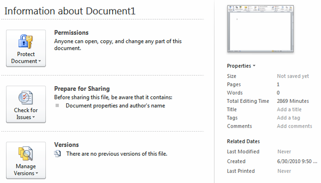 Info contains information about the current document. You can also inspect the document and edit document permissions.