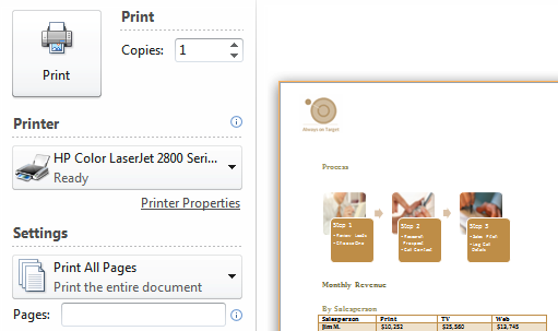 From the Print pane, you can change the print settings and print your document. You can also see a preview of your document.
