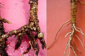 Okra roots damaged by root-knot nematodes. Note gall or root-knots (left) and healthy roots (right). © A.M. Varela, icipe |