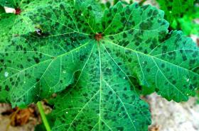 Black mould (Cercospora abelmoschi) leaf spots on the top side of an okra leaf © A.A. Seif & A.M. Varela, icipe |