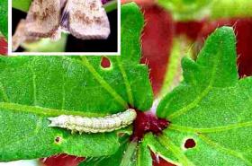 Young caterpillar of African bollworm (Helicoverpa armigera) feeding on okra leaf and a moth (inset). Fully-grown caterpillars are 35 - 40mm long. © A.M. Varela, icipe |