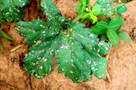 Adults and nymphs of the tobacco whitefly suck sap from leaves of okra plants. Attacked plants have low vigour and may wilt, turn yellow and die if whitefly infestations are severe or of long duration. Damage may be accentuated when plants suffer water stress. Whiteflies excrete honeydew on which supports sooty mould growth. This mould may cover the leaves during heavy infestation, and as a result the leaves may turn black, affecting photosynthesis.