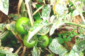 Phytophthora fruit rot fungus can cause damping-off in seedbeds, leaf spotting and collar rot on the main stem final resulting in plant death. The fungus may attack fruit at any growth stage and any part of the fruit. Spots on the fruit are dark brown, water-soaked and may have a light-coloured border. A whitish mould develops on the spots when wet conditions prevail. The spots are neither sunken nor exhibit concentric rings (zonation). Infected fruits drop prematurely.