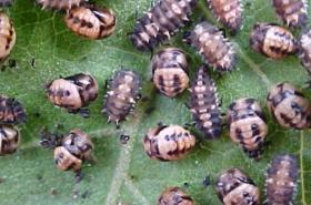 The adult beetle is oval in shape, about 6 mm in length and reddish brown in colour with black spots on their backs. They look very similar to the beneficial ladybird beetles (predators), but the body of this pest ladybird beetle is covered with short, light coloured hairs, which give them a non-glossy or matt appearance. The larvae are pale yellow and covered with branched spines.