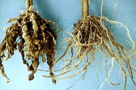 Root-knot nematodes (Meloidogyne incognita / M. javanica) Roots of severely attacked (left) and healthy plant (right). Affected plants are normally stunted and eventually wilt and die. The most characteristic symptom is formation of root galls (knots) and these can be seen with the naked eye. Affected roots rot. © A. M. Varela, icipe |