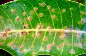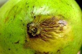 The most serious and widespread fungus is anthracnose. Anthracnose initially appears as small black spots. On leaves, the spots can grow to form an irregular patch. On young fruit, pin-sized, brown or black, sunken spots develop. Sometimes, a "tear stain" pattern develops on fruit. It is an important problem after harvesting the fruit, especially during transport and storage, where fruit can develop round, blackish sunken spots. The fungus is spread by rain splash and survives from season to season on dead leaves and twigs. Rainy weather during blooming and early fruit set will favour the development of anthracnose.
