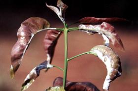Young fruit and also blossoms can be damaged by powdery mildew (Oïdium mangiferae). This fungus grows during warm weather with high humidity. It attacks flowers and young fruits. A case of powdery mildew can dramatically affect the harvest. An open, well-ventilated orchard can prevent mildew. In acute cases, mildew can also be brought under control with sulphur. When carrying this out, there should be no wind blowing, and the leaves should still be moist with dew.