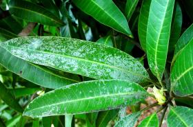 The mango leafcoating mite is tiny (about 0.2 mm), light coloured and cigar shaped. It cannot be seen with the naked eye. The mites leave in groups under a white coating on the upper leaf surface. The white coating can be easily rubbed off by hand. Leaves covered with the white coating tend to turn yellow and drop prematurely. In general, the coating has minimal effect on fruit yield.