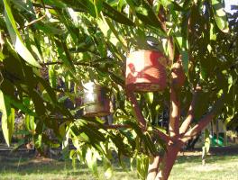 Smoke pots with holes in the bottom for air intake, containing wood shavings or sawdust with a topping of aromatic herbs (lemongrass etc) are hung at strategic places within the mango tree and the sawdust lit to produce a good amount of smoke which chases insects away from the tree.