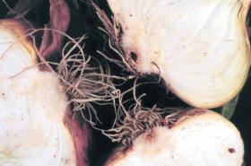 The above ground symptoms constitute yellowing of leaf blades at the tip. The yellowing at later stages covers the whole blade. The affected leaves shrivel and decay. Diseased plants can be easily pulled out because the root system is rotted. Affected roots are dark brown, flattened, hollow and transparent. When diseased bulbs are cut vertically, a brown discolouration is evident. The fungus survives in any soil moisture that permits crop growth. Infection is facilitated by injuries to root system, Losses can occur in the field and in storage.