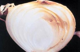 There are no symptoms on the outer surface of bulbs during early stages of disease development. When the bulb is cut open lengthwise, one or more of the inner scales can be found water-soaked or appears as if it has been cooked. The rot does not progress crosswise in the bulb. After the decay has progressed, the tissue begins to dry, the onion shrivels and secondary organisms can enter and cause a wet rot. The base of the bulb can be pressed hard enough to cause the centre core to slip out at the top, and for this reason the disease is known as slippery skin. The disease is favoured by high moisture.