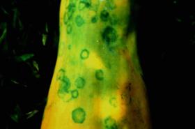 It is a devastating virus disease. In Africa, it occurs in Kenya, Nigeria, Tanzania and Uganda. Initially, the disease appears as oil streaks on stems and petioles and as it progresses, mottling of leaves becomes evident. Severely infected plants do not flower and die young. Infected fruits develop characteristic line patterns, which form rings and remain green when fruits ripen. The virus is spread by aphids and it is also mechanically transmitted.