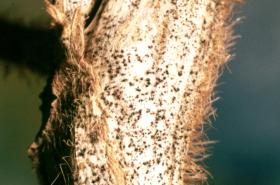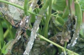 It is characterised by a rot at the base of the plant stem. The rot is covered by a cottony, fungal (mycelial) growth on which black irregularly shaped fungal bodies (sclerotia) are produced. Size of sclerotia varies from 2 to 22 mm in diameter. The disease infects the stem and pods. Large, black, round to irregularly-shaped sclerotia of varying size form on stems, which are partially covered with dense white mycelium. Sclerotia are also formed in the stem pith and are conspicuous when the stem is opened. Seeds may become infected within diseased pods. If infected early, seeds are flattened and shrivelled and sometimes replaced by black sclerotia. Attacked plants die prematurely, sometimes before seeds have formed. Infection occurs at flowering. Moderate air temperatures and frequent rains just prior to flowering to the pod development stage of growth favour the disease.