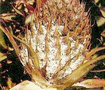 Base or but rot of pineapple is a common disease of crowns, slips and suckers used for establishing new plantings. Rot of planting material occurs when they are not dried and are packed with little aeration. The fungus also destroys older plants by entering through wounds caused in the collar region while weeding or other field operations. In severe conditions the entire plant may turn dark and rot within 2 or 3 days.