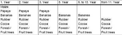 During the first few years, on fertile soils, papaya (Carica papaya) can also be cultivated in addition to bananas within the system (2 x 2 m). Together with the papaya seeds or bananas, trees growing up to the middle storey (such as Inga ssp., Erytrina ssp., Gliricida sepium) as well as growing up to the upper storey must also be planted. This can be in seed form. Only in the cases of certain varieties (such as palm varieties that are old, or difficult to germinate), should the trees be first sown in a tree nursery. The choice of tree depends on which varieties are available in the region. In addition to the varieties listed above, it is recommended to integrate palm species at a density of 100-150 trees per ha in organic cultivation systems.