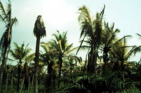 A putrid basal soft rot of the newly emerged spear (youngest leaf) occurs once foliar yellowing is advanced. Spear leaf collapse and rot of the apical meristem invariably precedes death of the palm at which point the crown topples away leaving a bare trunk. Infected palms usually die within 3 to 6 months after the appearance of the first symptoms.