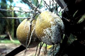 The coconut mite (Aceria (=Eriophyes) guerreronis) This mite is tiny and difficult to see with the naked eye. When very many mites are together they appear as fine whitish dust. The coconut mite attacks and damages the upper part of the nutlets under the sepals of up to 6 months old nutlets. Attack is severe during the dry season. Attacked nuts may fall or have a scarred husk, which often splits. The nuts of coconuts showing light scarring on the husk are not seriously affected but in heavily scarred nuts there is significant damage to the nuts. | ![]()