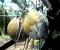 A number of scales feed on leaves and fruits of coconut palms. The most damaging is the coconut scale (Aspidiotus destructor). This scale is bright yellow and round (females) or reddish and oval (males) covered with a semitransparent greyish white flat scale. The scale diameter is 1.5 to 2.0 mm. Females are always wingless and remain under their scale their entire life. Adult males have one pair of membranous wings, move about actively in search of females and do not feed during the adult stage. Eggs are protected underneath the scale or shell of the mother insect until they hatch. Upon hatching the young scales leave the maternal scale, take up a position and start feeding. They do not move afterwards. They are found mainly on the undersides of the leaves, but frond stalks, flower clusters and young nuts can also be attacked.