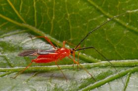 Helopeltis bugs, also known as mosquito bugs or mirid bugs, are the most important pests of cashew. These bugs are slender, delicate insects, about 7- 10 mm long with long legs and antennae, the antenna being nearly twice as long as the body. The females are red and the males brown to yellowish red. They lay eggs inserted into the soft tissue near the tips of flowering or vegetative shoots. Nymphs (immature bugs) are yellowish in colour. Both adults and nymphs feed on young leaves, young vegetative and flowering shoots, and developing fruits.