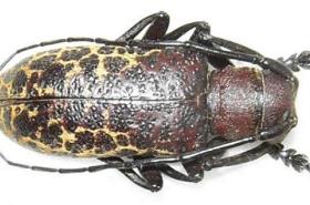 Adults are a long horn beetles, with a body length of 25-35 mm and with antennae longer that the body. The head and the thorax are dark brown; the wing cases are orange with large black blotches giving them a reticulate appearance. Adult beetles girdle branches from 3-8 mm in diameter leaving a V-section cut; only a narrow, central pillar round the pith zone is left, which eventually breaks off. Female beetles lay elongated eggs in transverse slits made in the bark of the girdled branch at points above the girdle. Larvae are yellow, in colour and reaches a length of 45 mm when fully grown. They mine in dead wood of the girdled branches. Pupation takes place in the dead wood. The lifecycle takes one year. This beetle is a common but usually minor pest of cashew in the Coast Province of Kenya. However, neglected plantations may be severely damaged. It is also present in Tanzania.