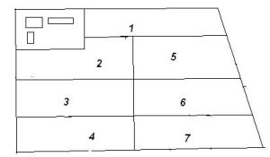 | Buildings are in the top left corner and the land possibly sloping downwards towards field no.7. The borders between fields on sloping land have contour strips or trees, but the main thing in crop rotation is that the disease prone crops are rotated with resistant ones to prevent problems building up in the soil. |