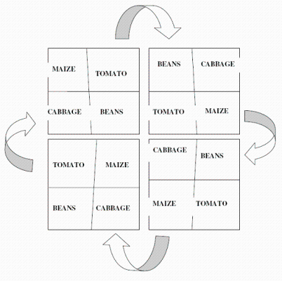 Most vegetable small-scale farmers in Africa identify 4 categories of vegetables; these are not overall botanically based but on their diversity in nutrient requirements. Cereals are also included in the rotation scheme with the vegetables. This concept meets the prerequisites of crop rotation:
