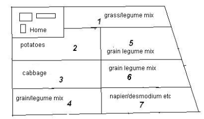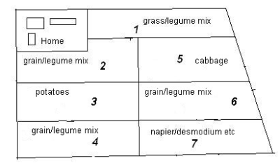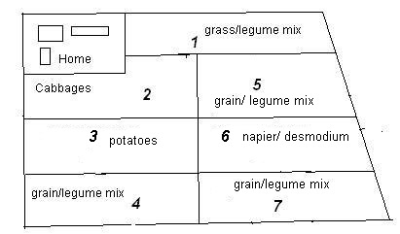 Assuming that the farm on the above field map has two grass fields, field no. 1 and field no 7, (remember 1 acre of plain napier grass can feed 1 grade cow, but 1 acre of napier intercropped with desmodium can feed 2 to 3 grade cows), there are 5 plots left for other crops. The family might need 3 plots for grains for home consumption. This would leave 2 fields for cash crops.