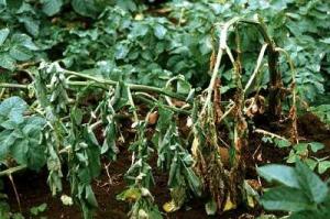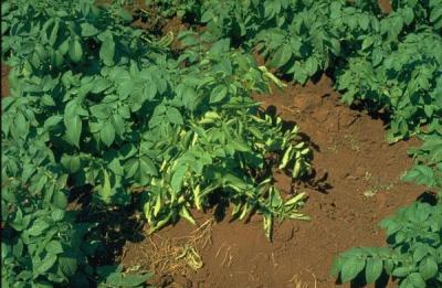 Bacterial wilt symptoms on potato plants. The first visible symptom on foliage is a wilting of the leaves at the ends of the branches during the heat of the day with recovery at night. As the disease develops, a streaky brown discolouration of the stem may be observed on stems 2.5 cm or more above the soil line, and the leaves develop a bronze tint.