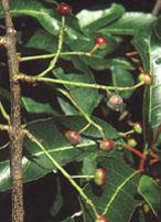 An evergreen tree up to 25 m tall or rarely, a shrub. In the forest the dense foliage is open, in grassland the tree is more stunted. The bark is black to dark brown, and has a rough corrugated or fissured and scaly texture, fissuring in a characteristic rectangular pattern. The leaves are leathery, glossy dark green and have margins with shallow rounded teeth. The leaf stalk is typically pink to reddish brown. The fruit is red to brown, rounded and about 1 cm; it is often bilobed containing one seed in each lobe. It grows in bunches. Prunus flowers and fruits are formed about 4 m high.Propagation and planting