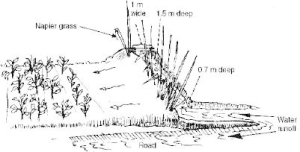 - Grass barrier strips planted along the contour. They are planted with fodder grass such as Napier, or are left with natural grass. They are effective soil conservation measures on soils that absorb water quickly, and on slopes as steep as 30%.