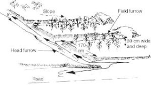 In a broadbed-and-furrow system, runoff water is diverted into field furrows (30 cm wide and 30 cm deep). The field furrows are blocked at the lower end. When one furrow is full, the water backs up into the head furrow and flows into the next field furrow. Between the field furrows are broad beds about 170 cm wide, where crops are grown.![]() |