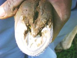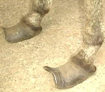Inspect a donkey's hooves daily and take care of them. A donkey.s hoof should be short and upright with an oval bottom. If the toe becomes long and slanted, it should be trimmed. Excess hoof wall, as well as ragged loose pieces of frog, can be removed with a sharp, strong knife. Cracks and chips in the wall can spread, and eventually destroy the entire hoof. Coating them daily with oil or grease may help hooves that are very dry or brittle, badly cracked or broken. This prevents them from further dehydration and assists healing.
