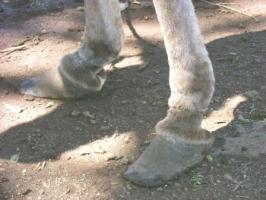 A donkey will pick up its foot if the tendon is pinched at the back of the leg, just above the pastern. Pick up and handle the feet of the donkey early and often in its training, calling a clear command like leg! so that it will not object to this care later on during its working life.