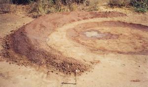 The curved heap of soil, shown above, will become the dam wall, while the excavated pit will be the water reservoir. The size of the dam wall and its reservoir depends on the capacity to remove soil from the reservoir and placing it on the dam wall. The gradient (slope) of the sides of the dam wall should be 2:1, which is 2 m width for every 1m of height.