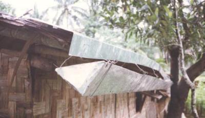 The best known gutter is semi-circular and made either of galvanised iron sheet or PVC. Gutters are laid in gutter brackets nailed onto facia-boards or in V-shaped tree branches nailed to the rafters with a gradient sloping towards the water tank. Bamboos and Sisal poles can also be used as gutters when split in two halves.