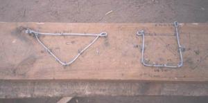 Gutters are fitted into hangers made of 3 mm galvanised wires that are bent over nails hammered into a piece of wood.