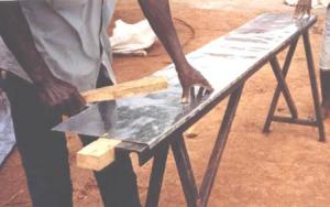 Cut galvanized plain iron sheets of gauge 26 or 28 into three strips, each being 200 cm long and 33.3 cm wide by marking the sheets with a thick wire, about 40 cm long, with each end having a sharp bend and a pointed end to scratch a line. The distance between the two bends must be 33.3 cm in order to make equal width of the cut sheets.