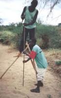 When the most promising lengths of a riverbed have been identified during an evaluation walk, they are probed using probing rods hammered into the sand. The probing data is used for: a) Drawing a plan and profiles of the riverbed to identify the deepest place from which water should be extracted and the shallowest place where the wall for a subsurface dam, a weir or a sand dam can be constructed. b) Estimating the volume of sand in the reservoir and the extractable volume of water from the sand. c) Providing the required data for drawing the designs and estimating the costs of construction, |