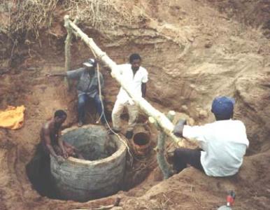 A safer method is to build a sinking well whereby curved concrete blocks are reinforced together onto a foundation ring made of concrete. The foundation ring is built in the excavation for the well.