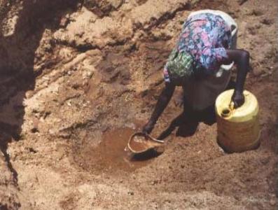 The oldest and simplest method is to dig a waterhole in a riverbed and use a calabash cut in half to scoop water into a calabash or a jerry can. |