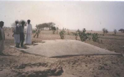 Hand-dug wells situated in riverbeds must be equipped with a well-head to prevent the well shaft being filled with sand during floods such as this hydro-dynamic well-head used in Sudan. It is shaped as a wedge to break the force of floods. |