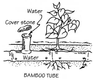 Instead of a PVC tube, also a bamboo tube can be used for drip irrigation. The bamboo tube is placed alongside the plants, with small holes in the tube near each plant. Water is put in the open end of the tube, either manually or using a bucket or drum, as described above.