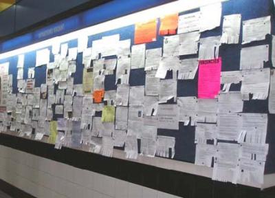 | The uneven ears seen on the notices pinned to the notice board are strips of papers with telephone numbers which can be pulled off by interested persons who want to phone for further details at a later stage. |